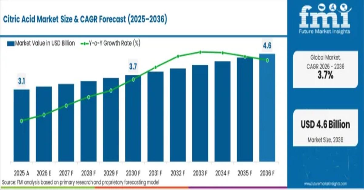 The global citric acid market has entered a phase of calibrated, efficiency-led expansion, with valuation crossing USD 3,179.1 million in 2025. According to new analysis by Future Market Insights (FMI), the market is projected to grow to USD 3,296.1 million in 2026 and further to USD 4,741.3 million by 2036, reflecting a steady CAGR of 3.7% over the forecast period.