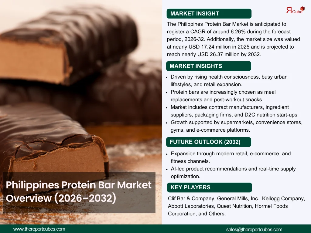 According to the latest report by The Reports Cube insights The Philippines Protein Bar Market is anticipated to register a CAGR of around 6.26% during the forecast period, 2026-32. Additionally, the market size was valued at nearly USD 17.24 million in 2025 and is projected to reach nearly USD 26.37 million by 2032.
