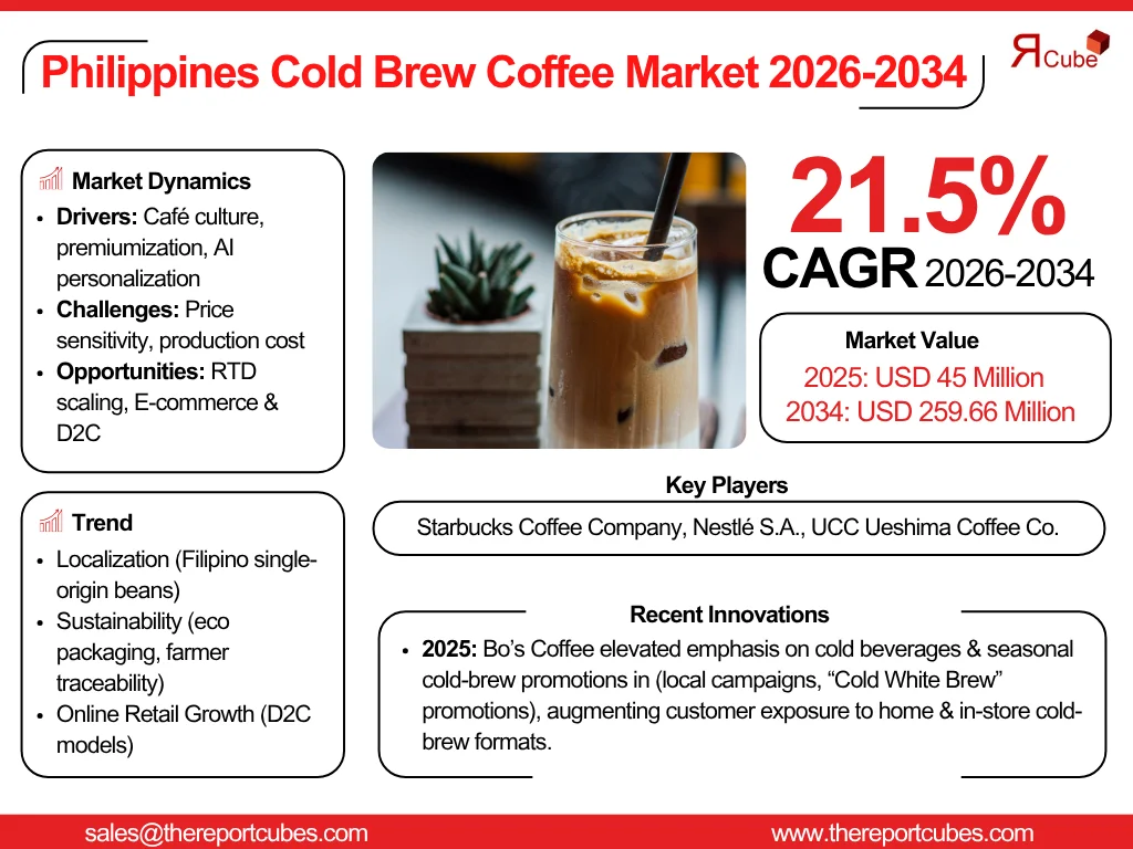 According to the latest report by The Reports Cube insights The Philippines Cold Brew Coffee Market is anticipated to register a CAGR of around 21.5% during the forecast period, 2026-34. Additionally, the market size was valued at nearly USD 45 million in 2025 and is projected to reach nearly USD 259.66 million by 2034.