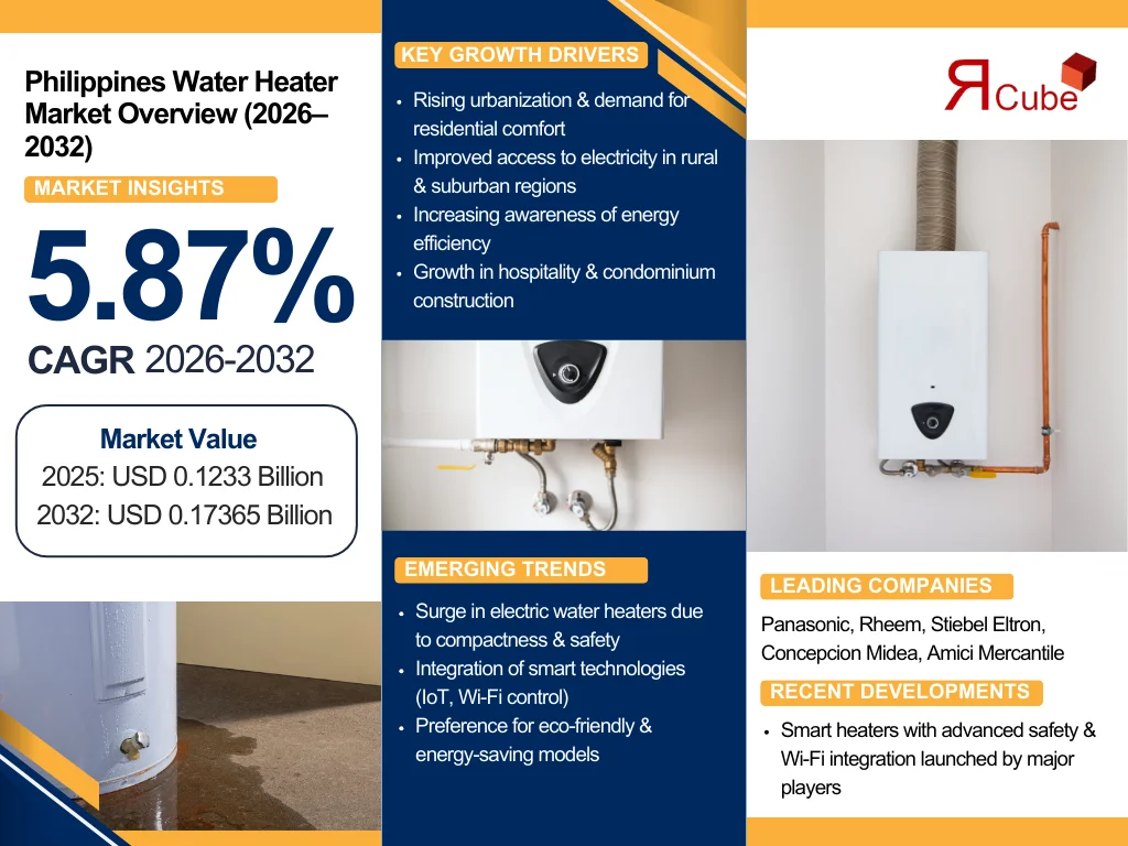 The Philippines Water Heater Market reached a value of nearly USD 0.1233 Billion in 2025. The market is assessed to grow at a CAGR of around 5.87%, during the forecast period of 2026-2032 to attain a value of around USD 0.17365 Billion in 2032. The industry is compelled by growing demand for residential comfort, increasing urbanization, and enhanced access to electricity in rural & suburban areas.