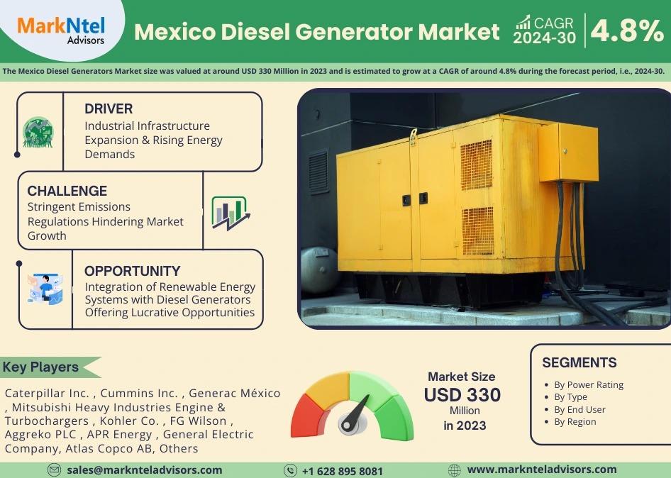 As per recent study by MarkNtel Advisors The Mexico Diesel Generators Market size was valued at around USD 330 Million in 2023 and is estimated to grow at a CAGR of around 4.8% during the forecast period, i.e., 2024-30.