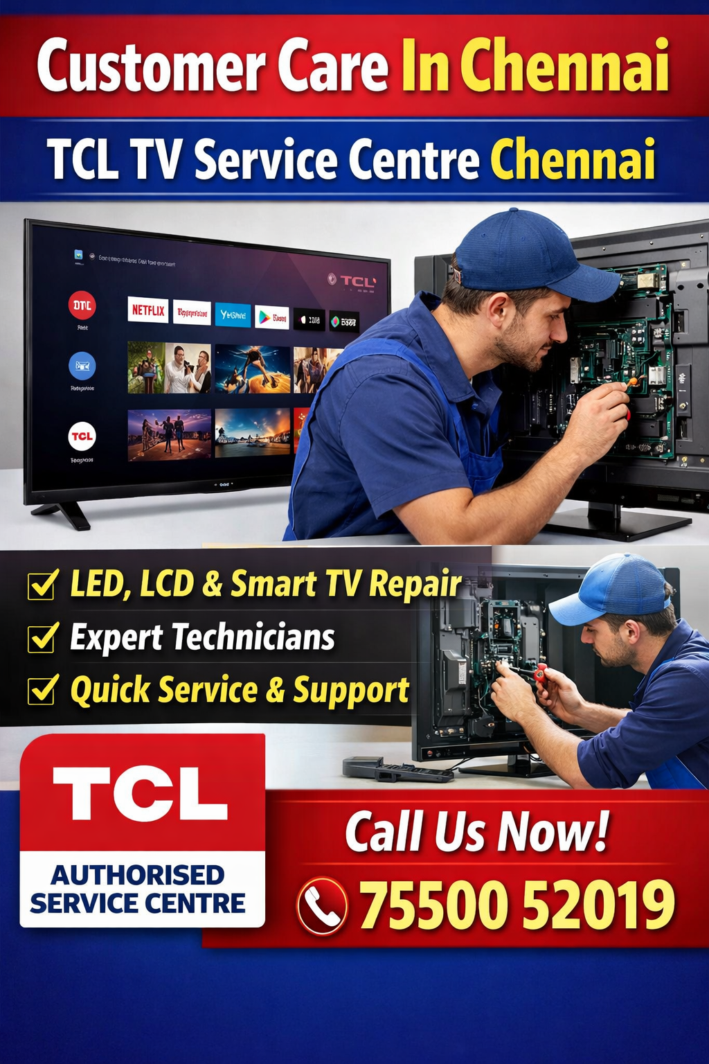 Customer Care In Chennai offers a reliable TCL TV service centre in Chennai with expert technicians for LED, LCD, and Smart TV repair. Fast doorstep service, affordable pricing, and genuine spare parts. Call 75500 52019 for quick support and trusted TV repair services in Chennai. Kindly visit our website www.customercareinchennai.com