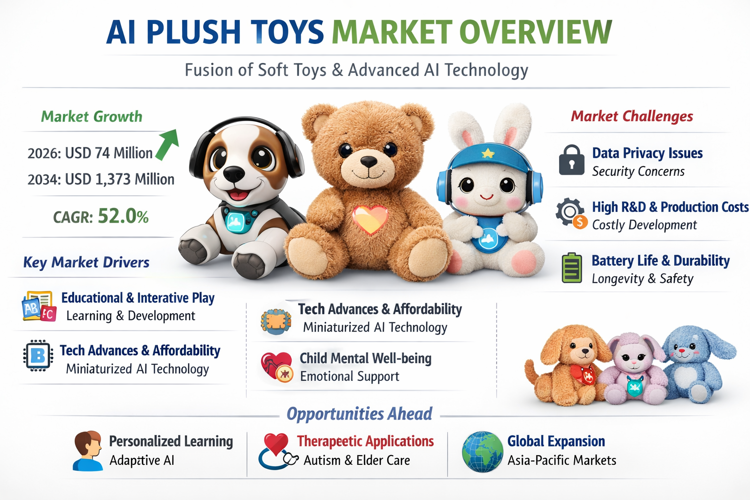 Can the AI Plush Toys Market Sustain a 52.0% CAGR to Reach USD 1,373 Million by 2034? According to a new report from Intel Market Research, the global AI Plush Toys market was valued at USD 74 million in 2026 and is projected to reach USD 1,373 million by 2034, growing at an extraordinary CAGR of 52.0% during the forecast period (2025–2032). This explosive growth is fueled by rising consumer demand for interactive and educational toys, advancements in AI and sensor technology, and increasing disposable income in emerging markets. https://www.intelmarketresearch.com/download-free-sample/3475/ai-plush-toys-2025-2032-669
