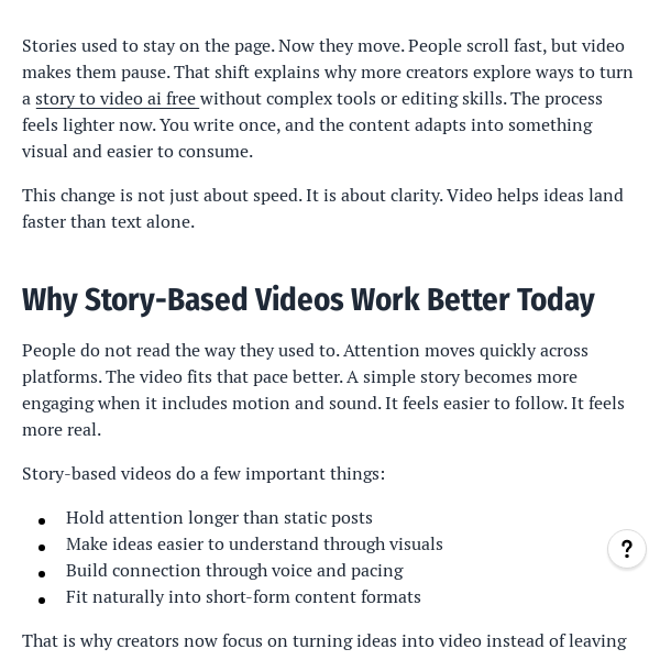Source Link: https://nextjournal.com/videogpt/how-to-turn-a-story-to-video-ai-free-using-an-ai-video-generator-app?change-id=E4ZXPG1oHEFSoSibQJyBbkHow To Turn A Story To Video AI Free Using An AI Video Generator App Struggling to turn your ideas into videos? Learn how to use story to video AI free tools to create engaging content faster. Read the blog now and start building videos from your stories with ease. Source Link: https://nextjournal.com/videogpt/how-to-turn-a-story-to-video-ai-free-using-an-ai-video-generator-app?change-id=E4ZXPG1oHEFSoSibQJyBbkNEXTJOURNAL.COMHow to Turn a Story to Video AI Free Using an AI Video Generator AppStories used to stay on the page. Now they move. People scroll fast, but video makes them pause. That shift explains why more creators explore ways to turn a story to video ai free without complex tools or editing skills. The process feels lighter now. You write once, and the content adapts into something visual and easier to consume.0 Comments 0 Shares 87 Views 0 Reviews -